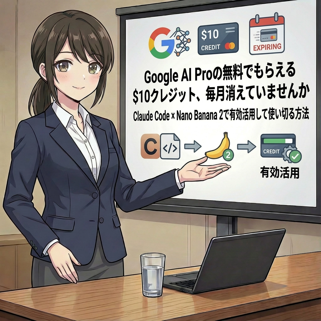Google AI Proの月額$10クレジット、使えていますか?放置すると毎月消えます。Claude CodeにNano Banana 2をMCPでつなげば、このクレジットで月150枚の画像生成が実質無料でできる。設定は一度だけ。2時間か...