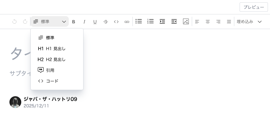 書式ドロップダウン:標準、H1見出し、H2見出し、引用、コードから選択