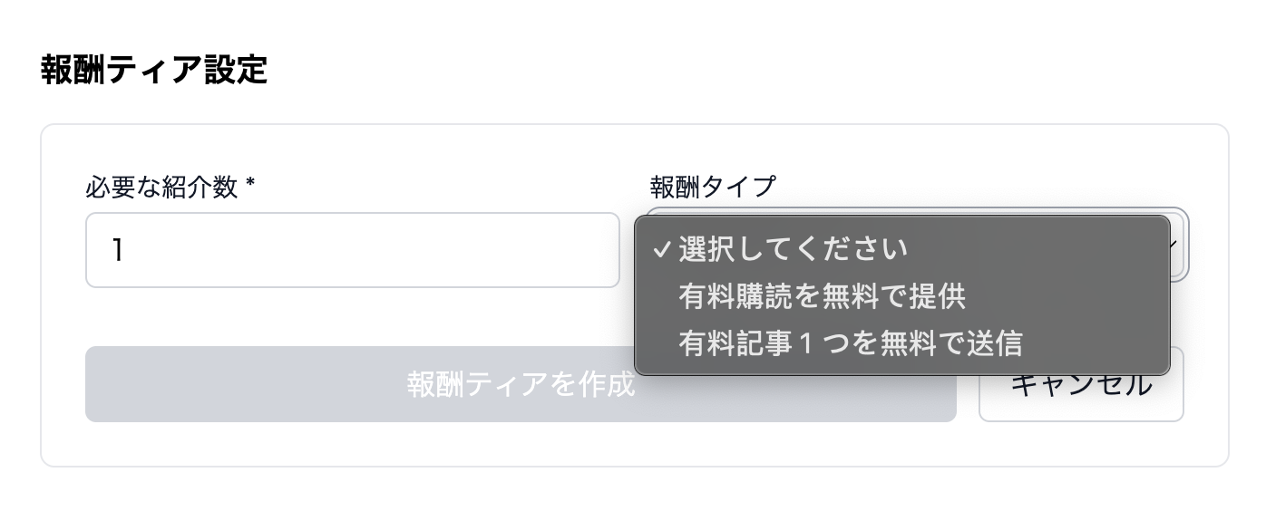 報酬ティアは、紹介人数に応じて段階的に獲得できる特典のことです。 例えば「3人紹介で特典A、5人紹介で特典B」といった設定ができます。